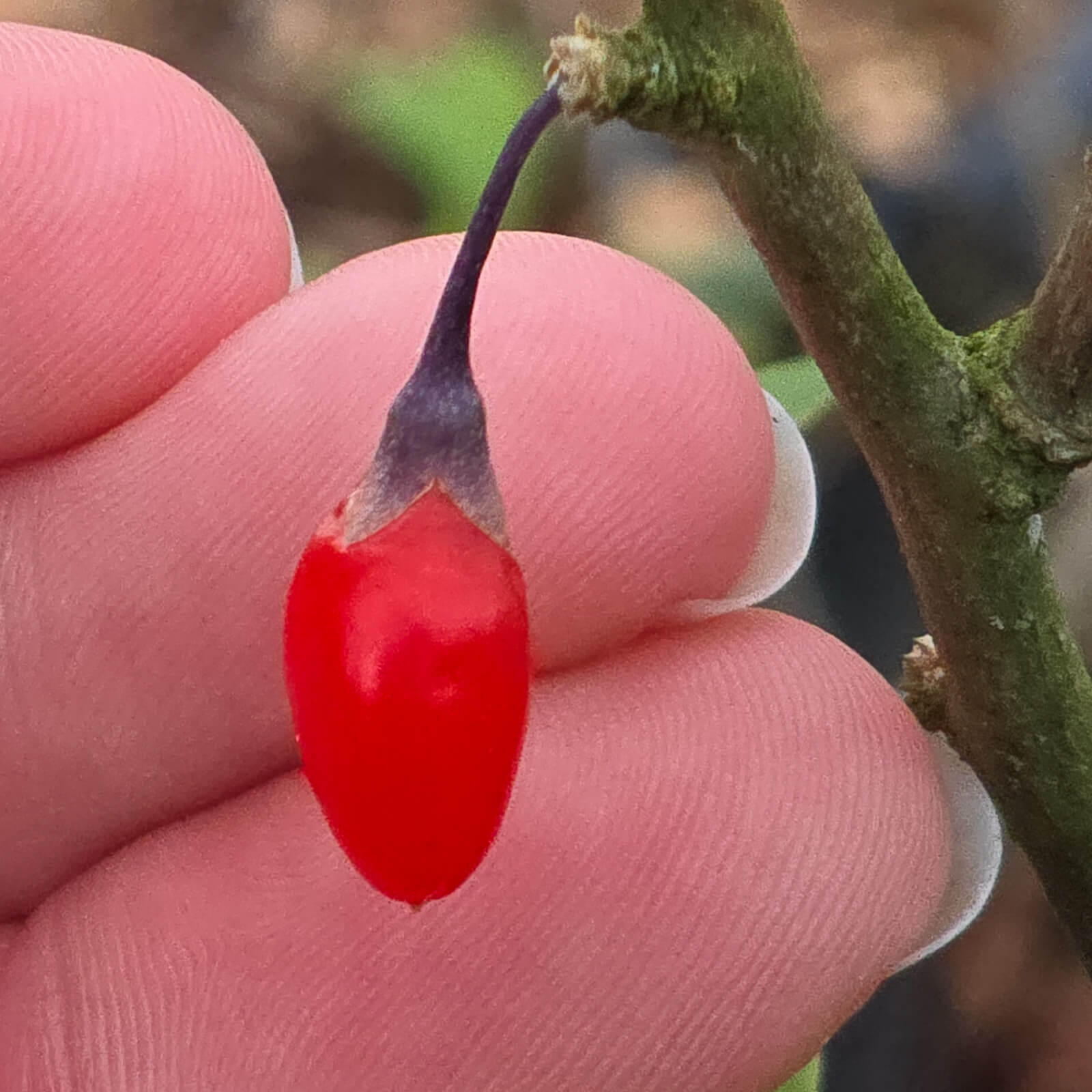 Goji berries reproduce relatively easily through cuttings. It is a spiky plant that seems to prefer the cooler seasons, (spring and fall). It puts out small red edible berries. It is also cold tolerant to well below zero degrees