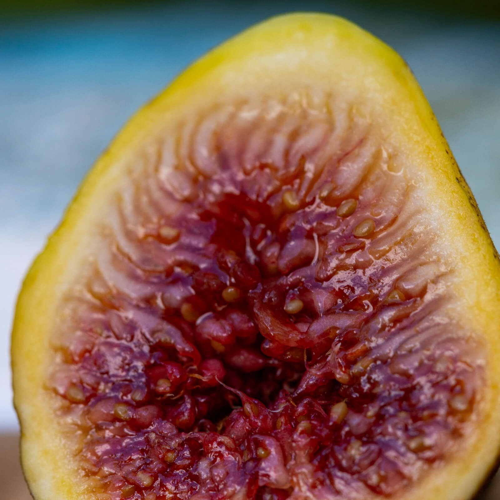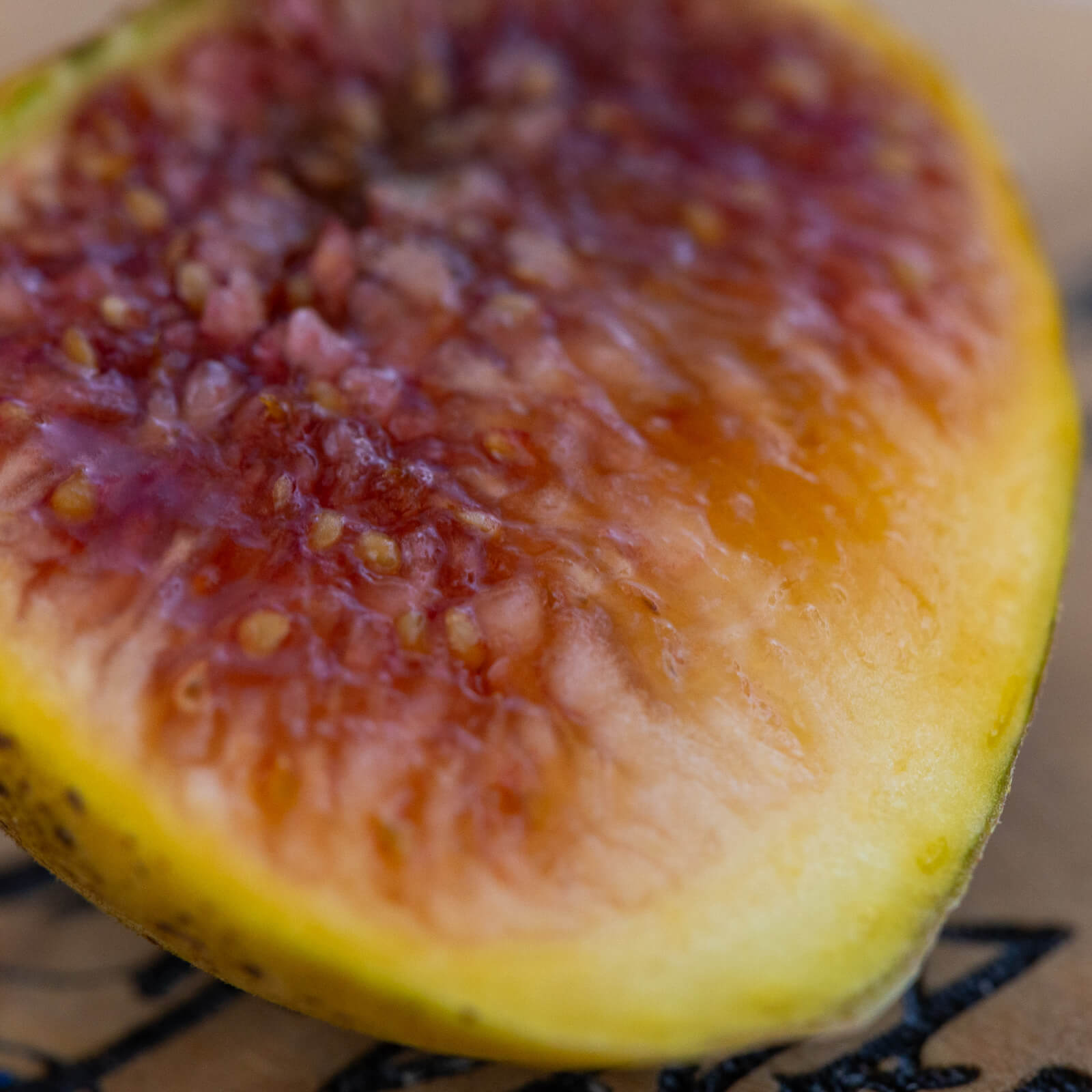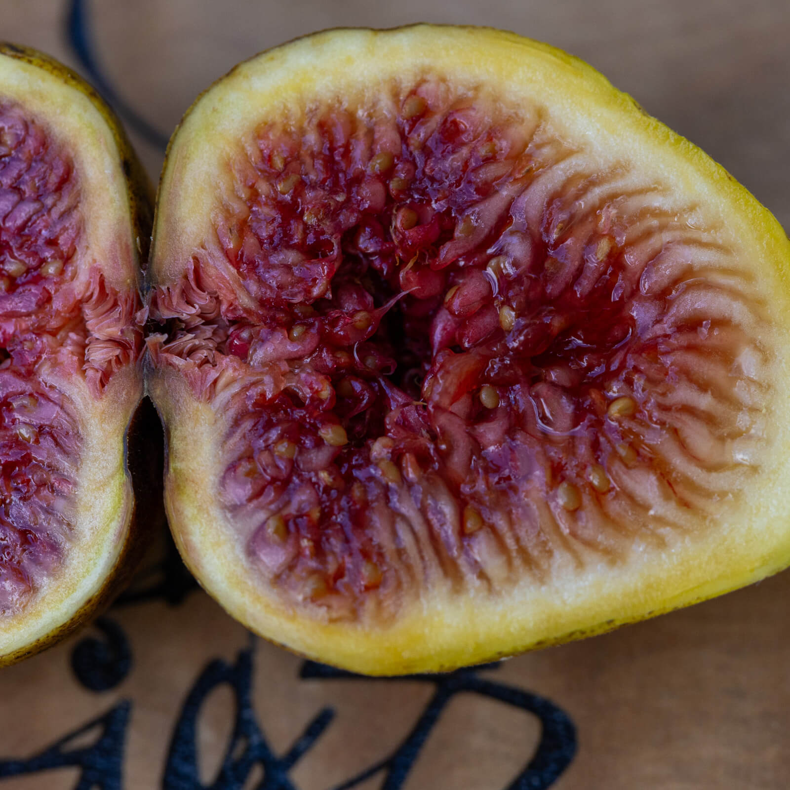 An Italian honey fig with both striped wood and figs, and an interesting long fingered leaf shape.