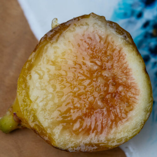 A really good, decent sized yellow honey fig. It gets a bit of redish coloration creeping into the interior as it gets very ripe.